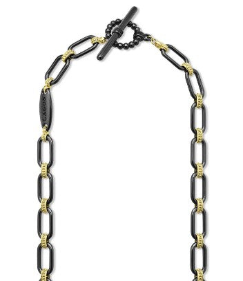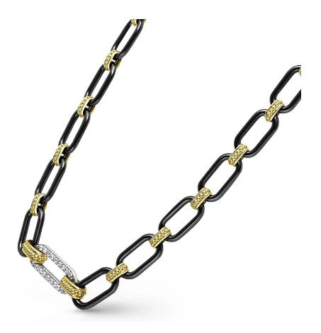 Black ceramic and 18K gold accented by a single diamond station forms this bold link necklace. LAGOS diamonds are the highest quality natural stones.