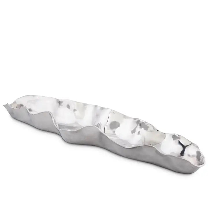 Add a touch of modern romantic fantasy to your home with our functional modern art-inspired Arthur Court platter. Constructed of shining aluminum with a modern wave design edge. Serve your favorites on it or display as the work of art it is anywhere in your home. Arthur Court’s wavy edged Carmel Collection is California inspired by the fairy tale village of Carmel-by-the Sea. Nestled into the rolling hills where California’s central coast meets the gentle waves of the Pacific, the magical hamlet is filled with storybook cottages wearing roofs that swoop and roll, echoing the undulating waves of the sea. Size: 24" Long x 6" Wide Care: Hand-wash in warm, soapy water, dry thoroughly.