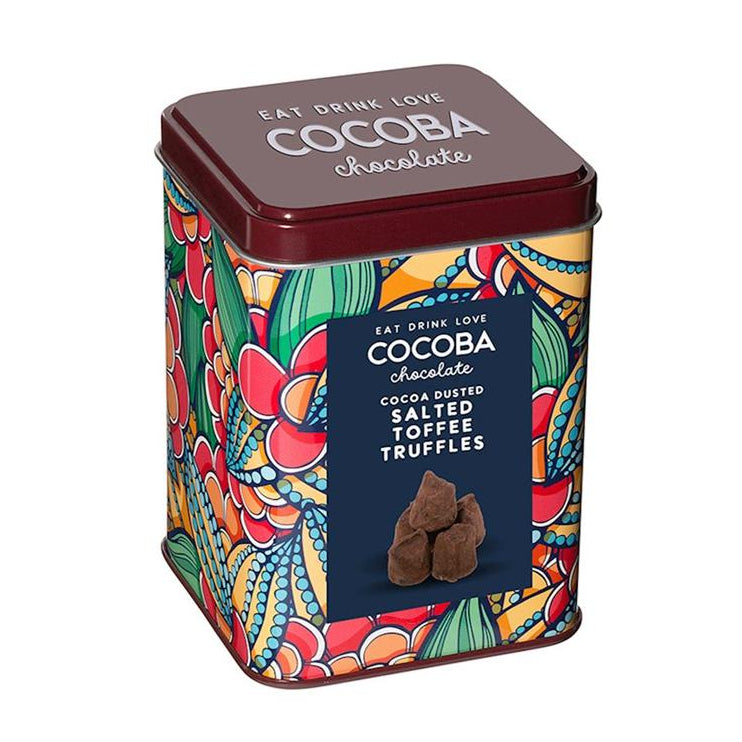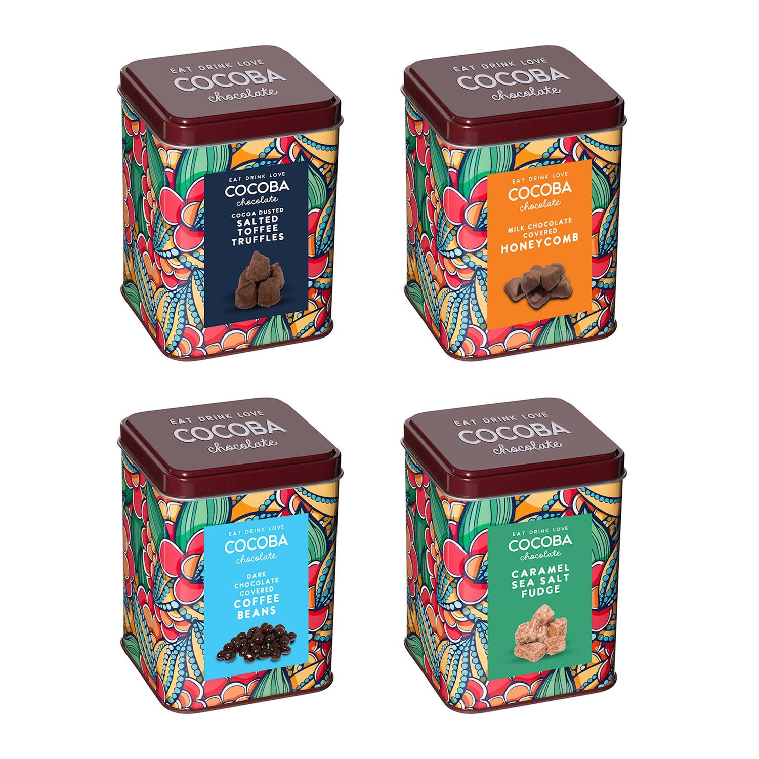 Delight in the ultimate chocolate indulgence with the Cocoba gift tins.. This luxurious collection features four irresistible treats, each crafted with premium ingredients for an exquisite taste experience. The beautifully designed gift tins contain six pieces each of Cocoa Dusted Salted Toffee Truffles, Caramel Sea Salt Fudge, Dark Chocolate Covered Coffee Beans, and Milk Chocolate Covered Honeycomb. Whether you're treating yourself or searching for the perfect gift, this gourmet assortment is sure to impress chocolate and confectionery lovers alike.