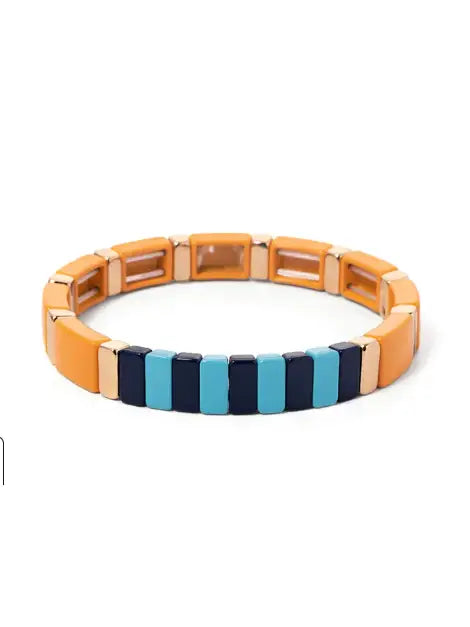 This gold and rainbow colored tile bracelet is so perfect to pair with your bracelet stack! These colors are perfect going into Fall and really go with everything! Strung on elastic cord for ease and comfort.