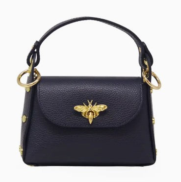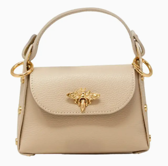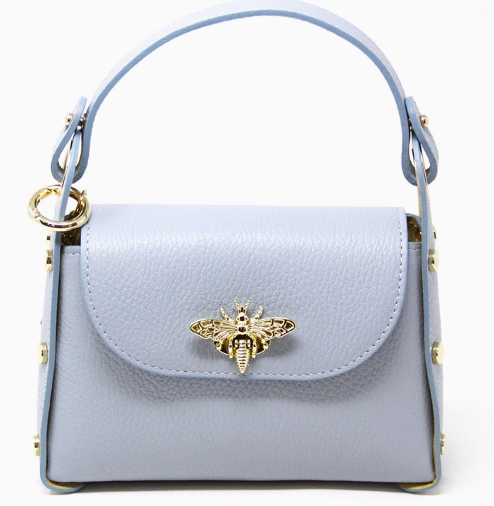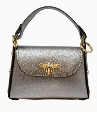 The Leather Bee Mini Bag is a stylish designer handbag made from premium leather. It features an eye-catching butterfly logo on the front that sets it apart. Inside, you'll find a spacious main compartment secured with a zip closure, along with a long shoulder chain for effortless carrying. Measurements: 7''W x 5''H x 2.5''D