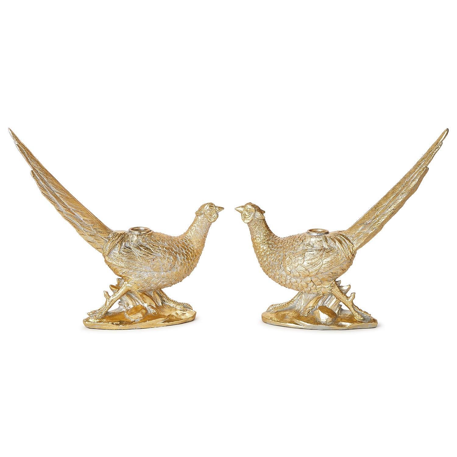Add a touch of elegance and sophistication to your dècor with these pheasant candleholders. Featuring intricately detailed figures with a luxurious gold finish, they serve as both functional taper candleholders and decorative statement pieces. Perfect for dining tables, mantels, or holiday displays, these pieces bring a refined and timeless charm to any setting.