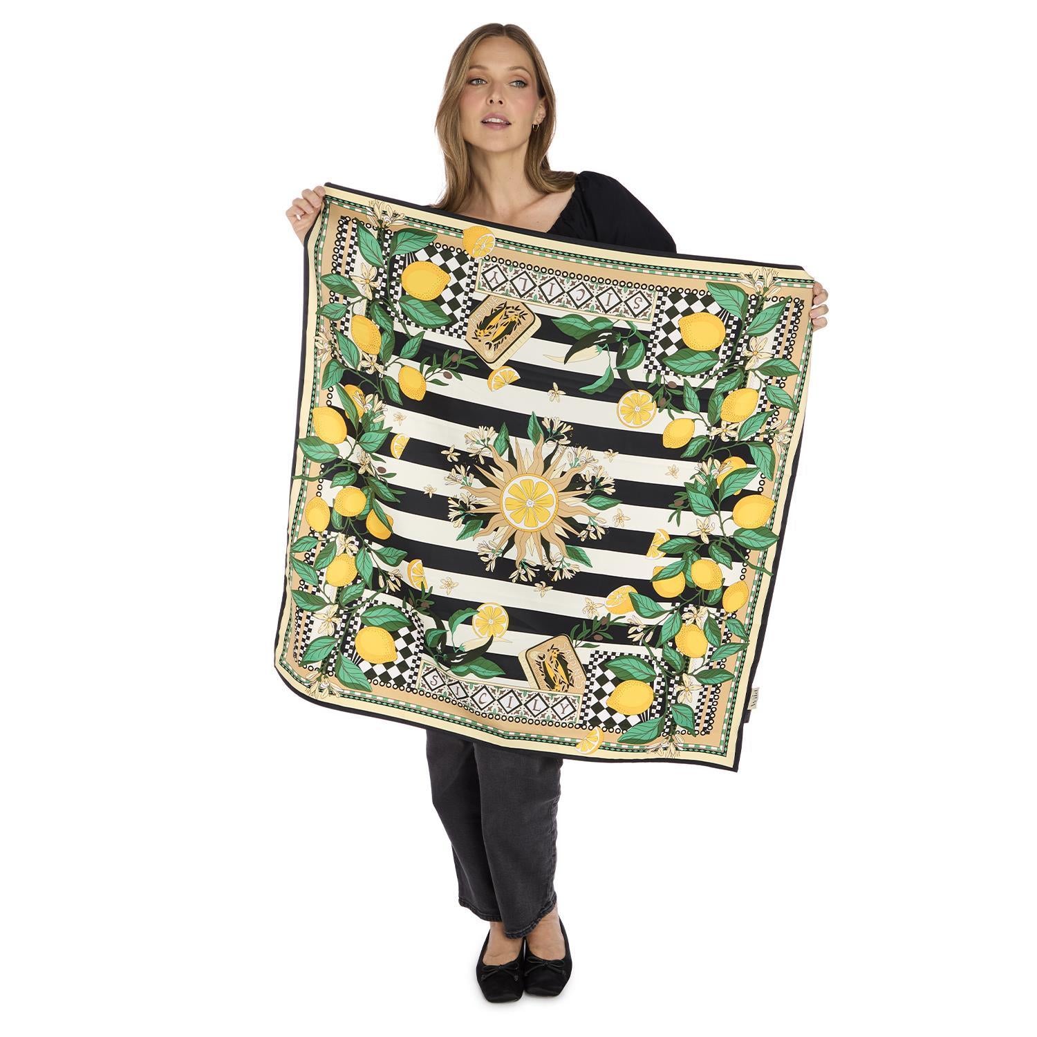 Indulge in the allure of the Sicily Print Black/White Medium Square Scarf by Wild Paris. Crafted with recycled polyester, this exquisite piece exudes both elegance and sustainability. Measuring 35" in both width and length, this scarf is perfect for draping over your shoulders or tying around your handbag for a touch of sophistication. Embrace the charm of Sicilian style wherever you go with this versatile accessory.