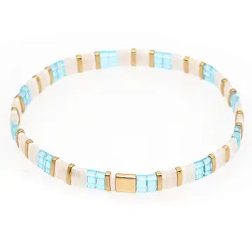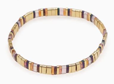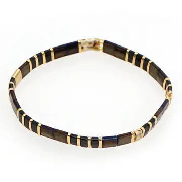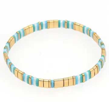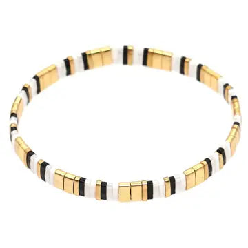This elegant bracelet features multiple layers of braided Tila beads combined with gold beads, crafted from 100% rice beads. Designed in a one-size-fits-all style, it offers a refined accessory that complements any sophisticated ensemble.