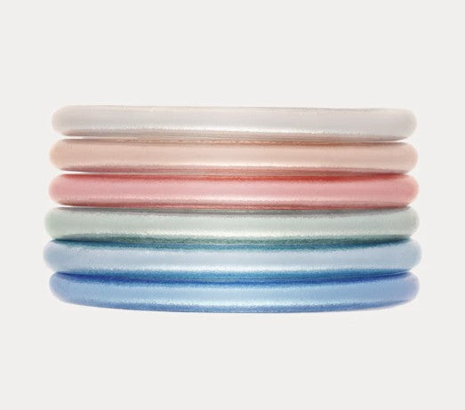 The stack is built on a harmonious, cool-toned gradient featuring an effortless sweep of Silver, Champagne, Rose Gold, Mint, Celeste, and Azure All Weather Bangles®. Each single bangle layers together to create a soft, iridescent shimmer that catches the light beautifully. It is an airy, grounding statement for the woman who finds luxury in moments of quiet clarity and peace.