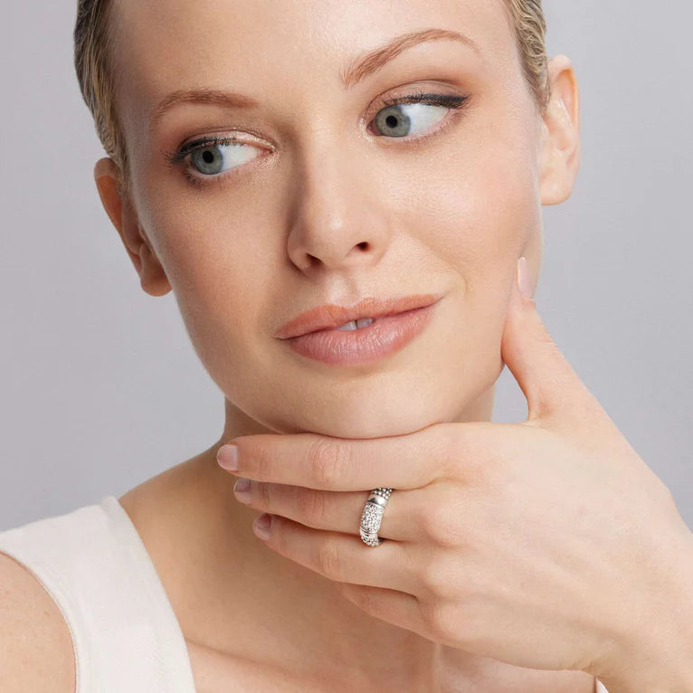 Pavé diamonds and sterling silver Caviar beading form this unique band ring. LAGOS diamonds are the highest quality natural stones.