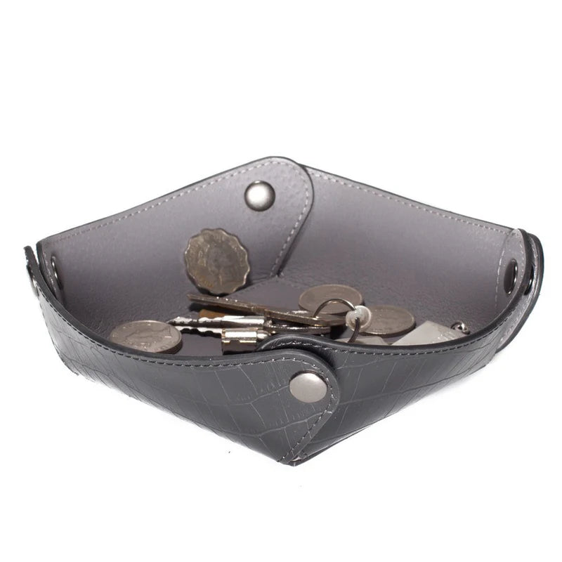 The perfect minimal tray with a black croco leather exterior. Throw your keys and sunglasses in here after a long day at the office. Collapsible with corner snaps allows for easy transportation. (#2125)